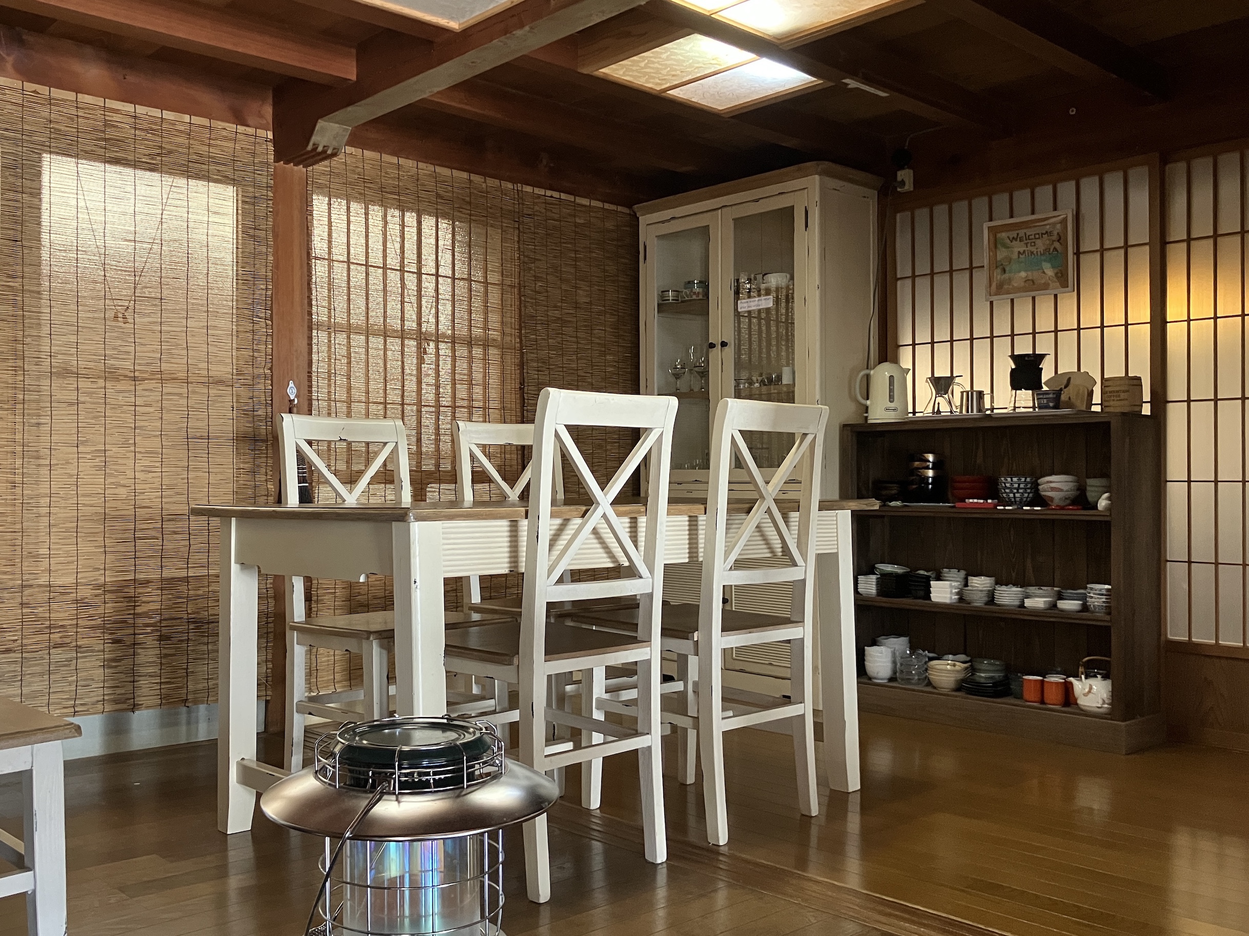 ロビーと土間台所の間にあるダイニングルーム。ごはんを食べたりお茶を飲んだりして下さい。